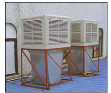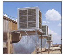 用循环水泵不间断地把接水盘内的水抽出,并通过布水系统均匀地喷淋在蒸发过滤层上,使室外热空气通过蒸发换热器(蒸发湿帘)内与水分进行热量交换,通过水蒸发而达到降温,清凉、洁净的空气则由低噪音风机加压送入室内,其可以达到降温4-10度的效果。 |